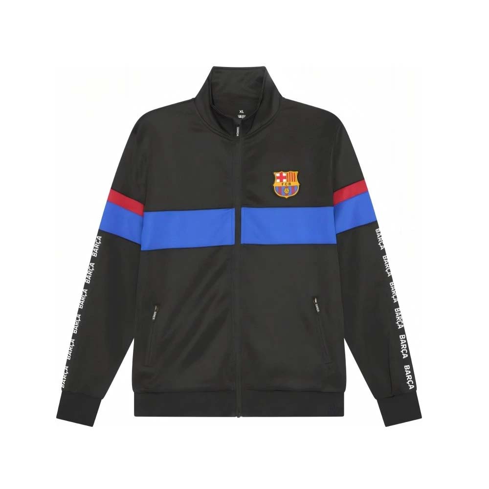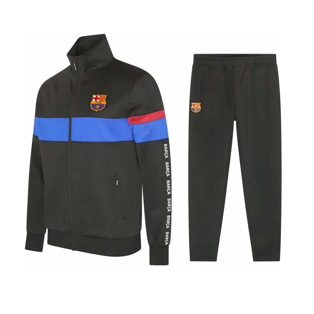 Detská tepláková súprava FC Barcelona.je ideálnou voľbou pre všetkých verných fanúšikov katalánskeho veľkoklubu, či už na tréning, športové aktivity alebo pohodlné domáce nosenie. Táto oficiálna súprava Barça v štýlovom dizajne kombinuje čiernu farbu s ikonickými klubovými farbami – modrým a červeným pruhom na bunde. Na hrudi a stehne sa hrdo vyníma klubový znak FCB. Mikina so stojačikom má praktický celorozopínací zips a dve vnútorné vrecká na oboch stranách so zapínaním na zips s ozdobnou rúčkou.Na rukávoch opakujúci nápis Barça. Nohavice s dvoma vnútornými vreckami po stranách, s elastickým pásom a zipsami na členkoch pre maximálne pohodlie a funkčnosť. Možnosť potlače vlastného mena a čísla.Čierna farba..95% polyester a 5% elastan. Oficiálny produkt FC Barcelona.