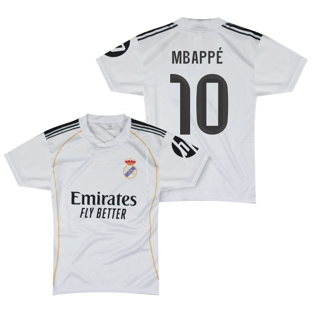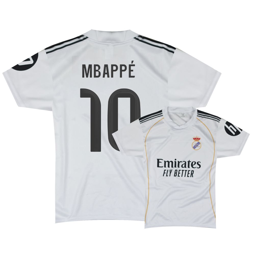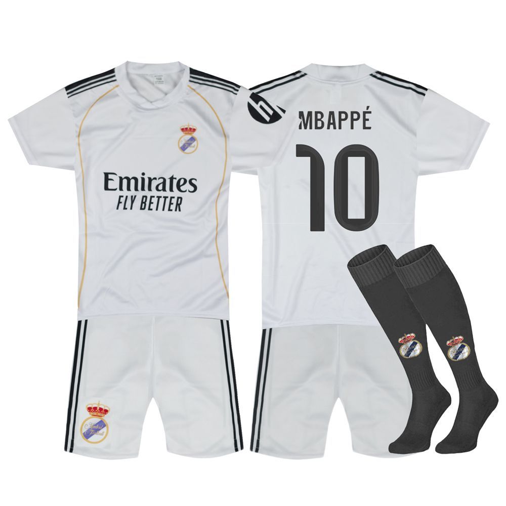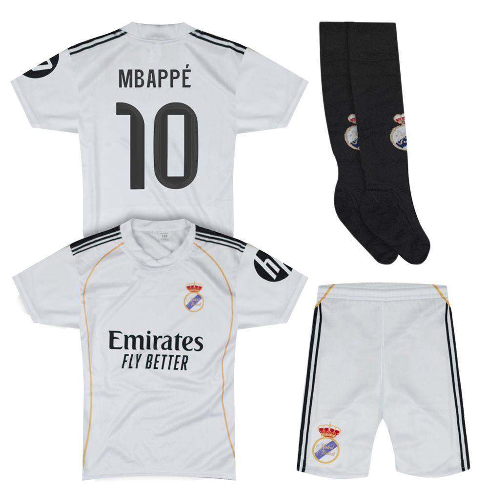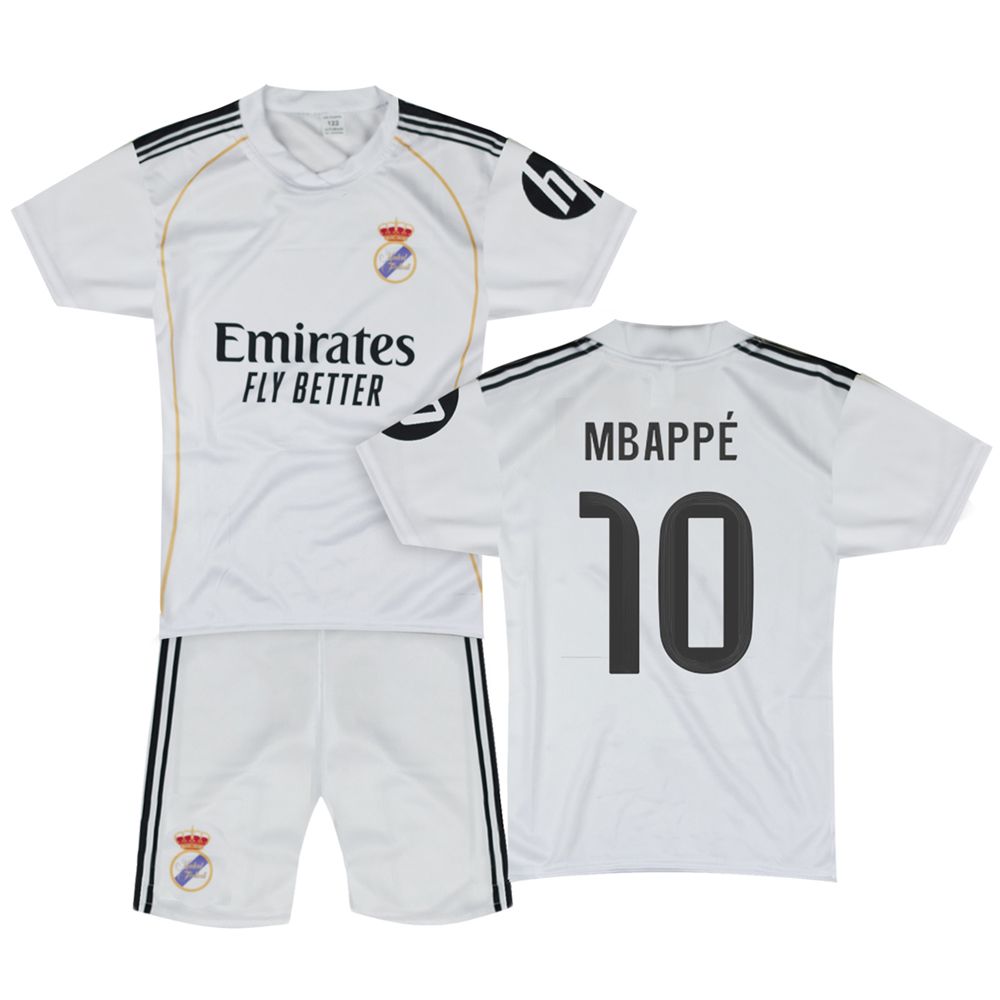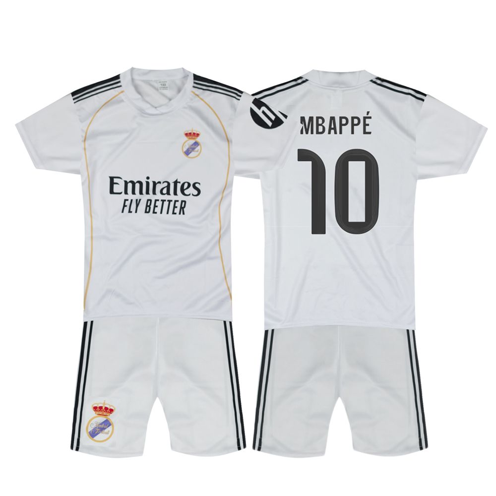 Detský dres Mbappe Real Madrid 2025/26 na štýl originálnych dresov replika vyrobený ako replika pre všetkých malých fanúšikov Realu a Francúza. Štandardný strih. Sada obsahuje tričko a šortky. Na zadnej strane charakteristické číslo 10 a meno Mbappe. Klubová biela farba.