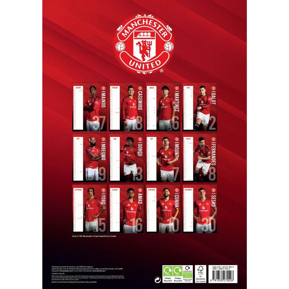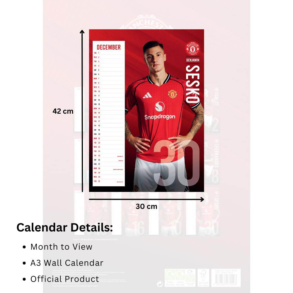 Kalendár Manchester United 2026 pre všetkých fanúšikov Red Devils. Jedna titulná fotka a 12 ďalších. Fotky hráčov v drese, meno a klubový znak. Formát A3 (300 x 420 mm), väzba krúžková. Oficiálny produkt Manchestru United.